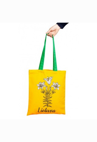 Medžiaginis maišelis Lelijos geltoname fone, 35 x 40 cm,rankena 68 cm, pagamintas iš medvilnės audin