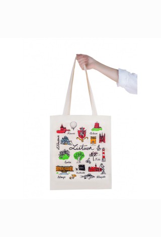 Medžiaginis maišelis, Lietuvos miestai ir simboliai. Dydis 35 x 39 cm, rankenos 60 cm. Pagamintas iš