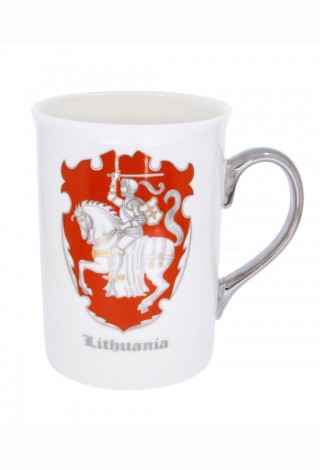 Porcelianinis puodelis Lietuva, Vytis, sidabrine rankena, 300 ml, supakuotas baltoje dėžutėje.
